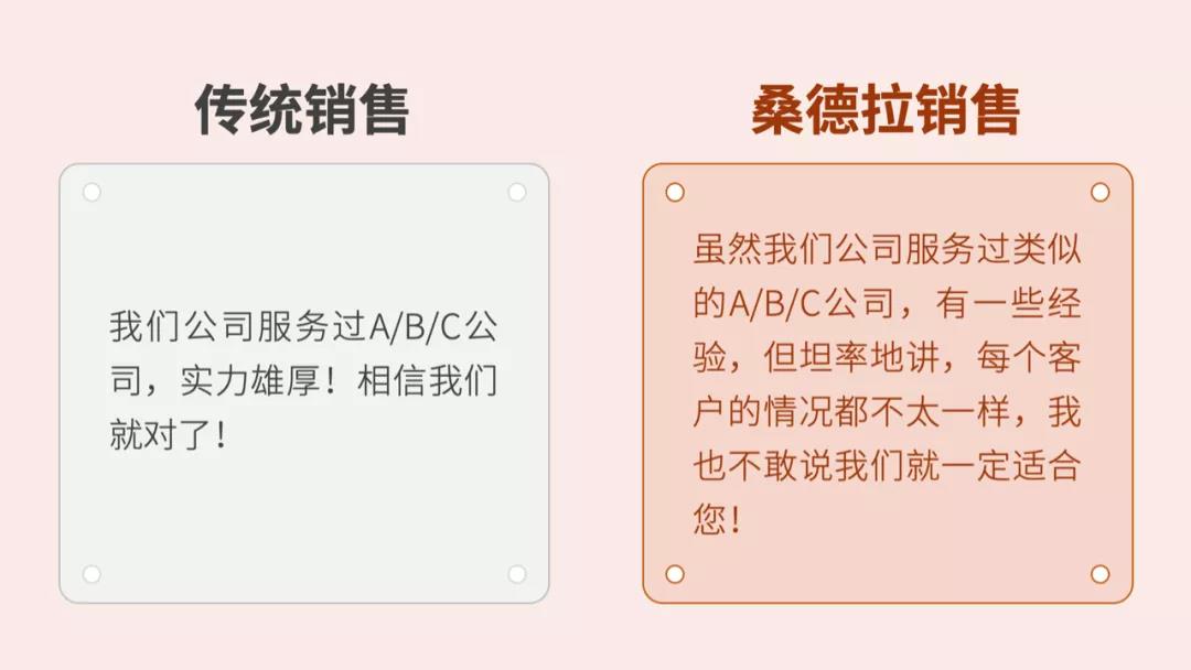 比如,潛水艇的第一個艙門是——銷售要和客戶建立良好的信任關(guān)系,這第一步看似簡單,卻決定了客戶會不會跟你合作。下面,通過幾個案例感受一下傳統(tǒng)銷售和桑德拉銷售的區(qū)別。